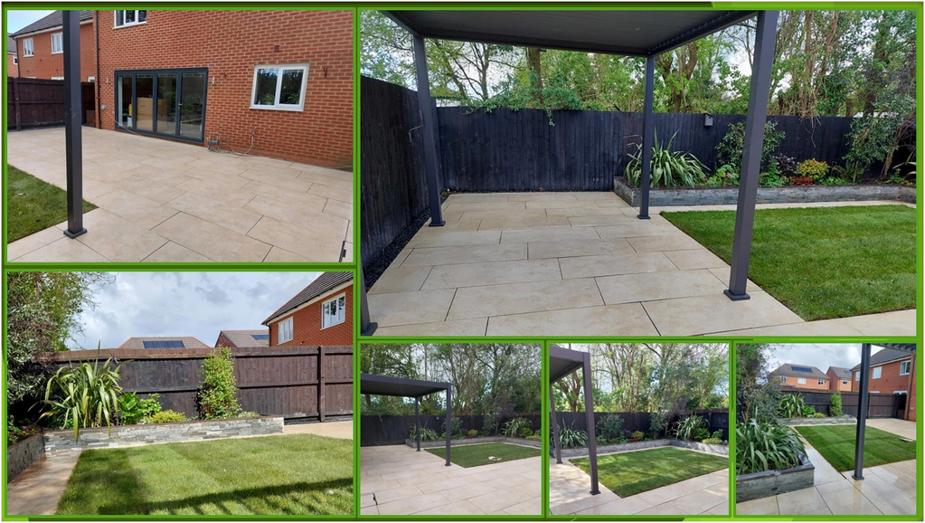 So this job done for a lovely couple it was a sloping un usablegarden so we made it 2 tier we put land drains in and re turfed the lawn we also created a sleeper retaining wall with steps and then used a daytona beige porcelain as the patio and put a new gate on what a transformation this is.