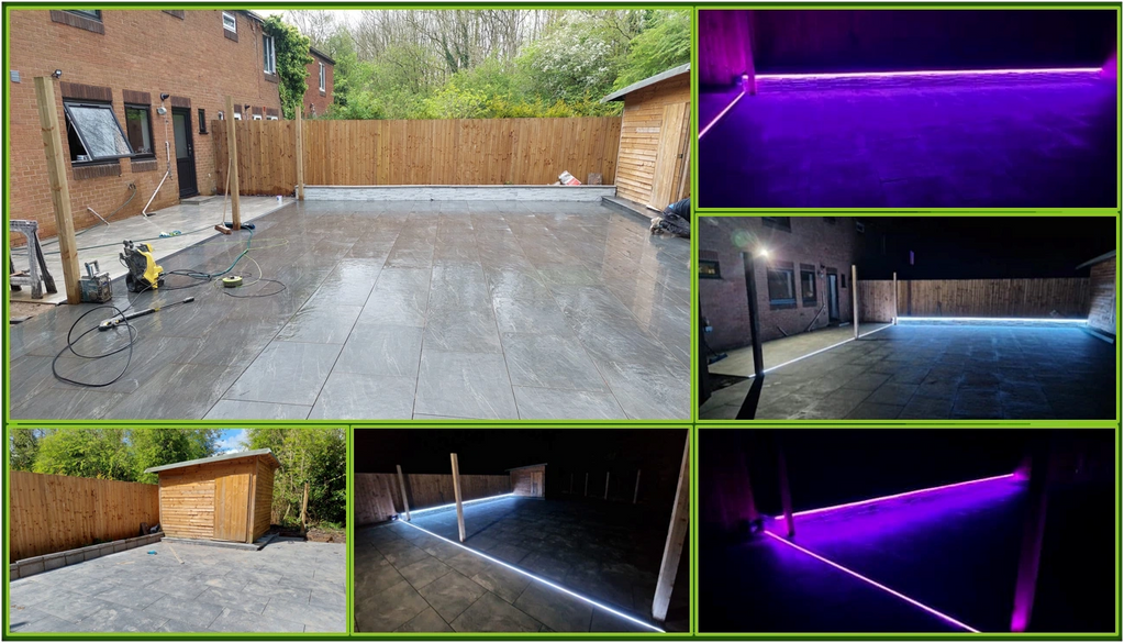 68 tone out and laid 143 meters off porcelain, 2 different colours were the lighter colour with a gazebo structure. We also built a wall and tiled that in white. We then we put outdoor sockets in plus led lights under the copping stones on the wall, and also in the floor tiles. To finish we done 80 meters off resin on the drive looks stunning.